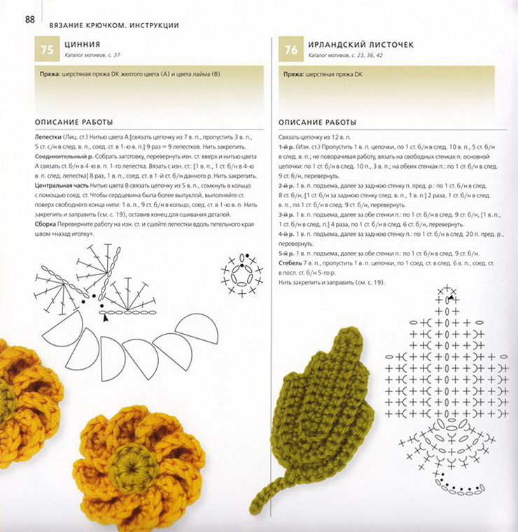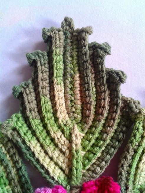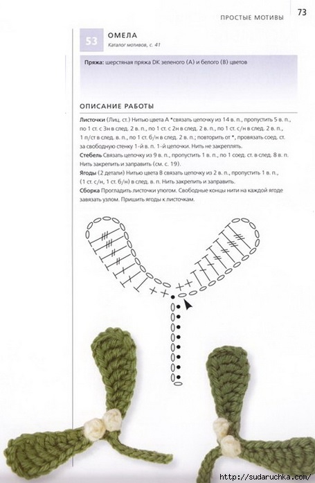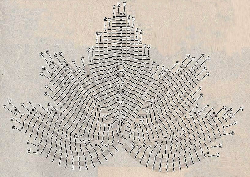 - 1 стлб в последнюю п. Т. о. в ней всего получается провязанных два стлб, [1 ст.б/нак. в крайнюю п. следующ. листа]х4, 16 ВП, 1 ст.б/н. во 2-ую п. от крючка, [1 ст.б/н. в след. п.]х14 раз, СС в 1-ый стлб серединки.