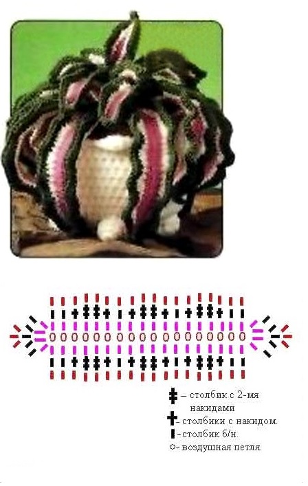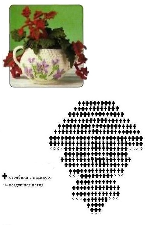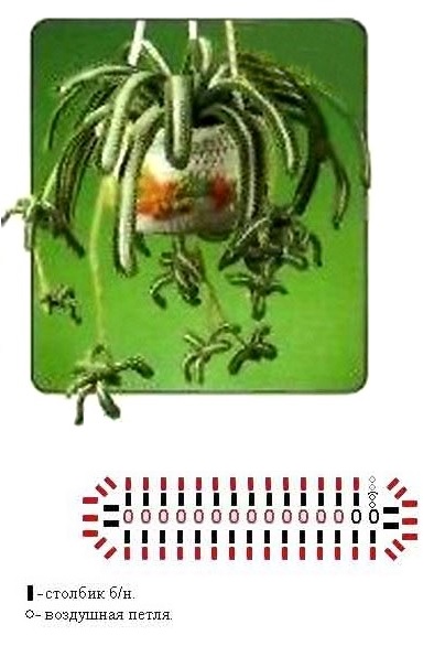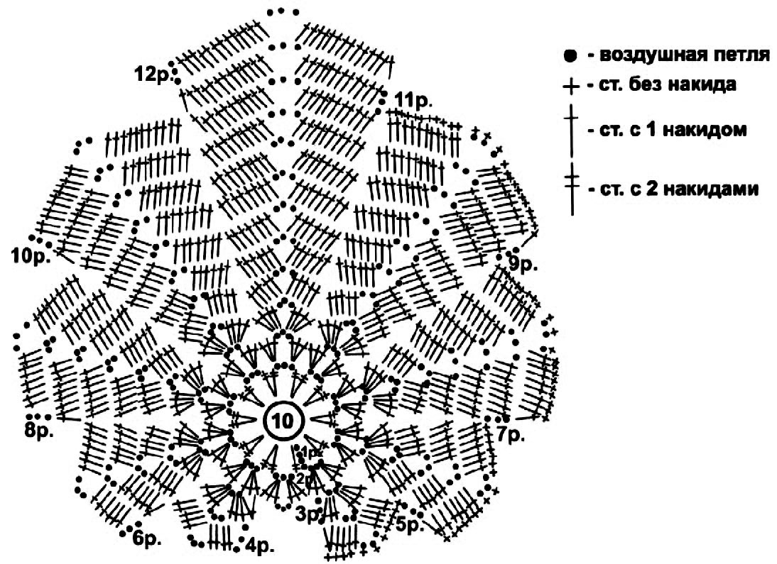 Дальнейшее вязание узора – см. схема. Четные рядки прикрепляем столбиками без/н к стлб без/н 9-го рядка.
