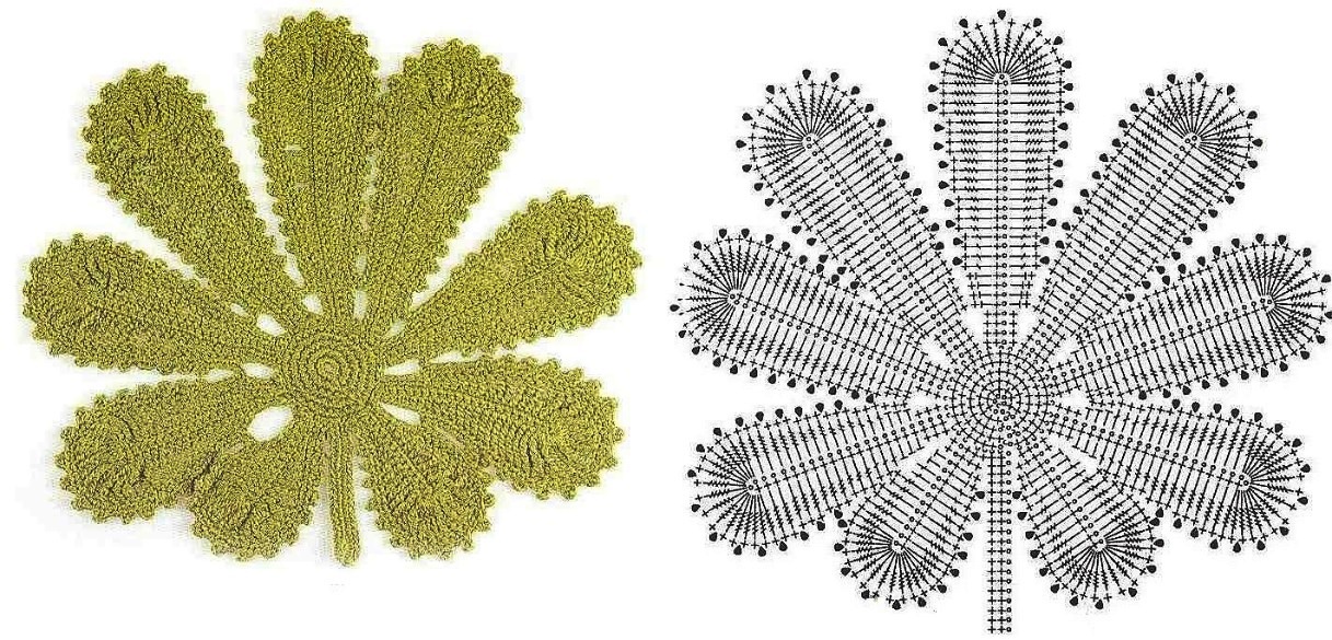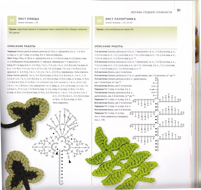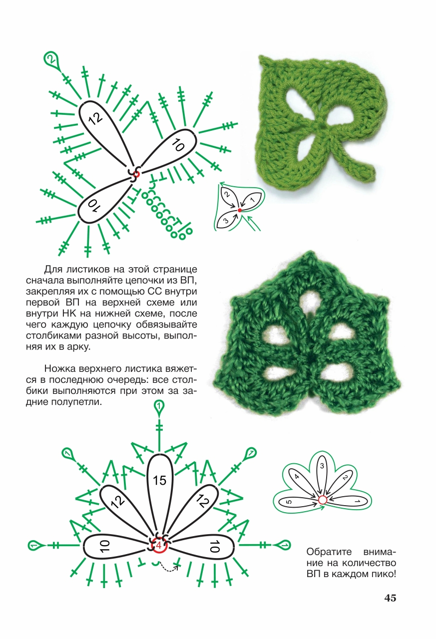 Начинаем с узора серединки, затем поочередно вяжем элементы листочка. В описании рассмотрена схема узора самого маленького элемента. Остальные вязать аналогично, регулируя длину кол-вом п. в цепочке.