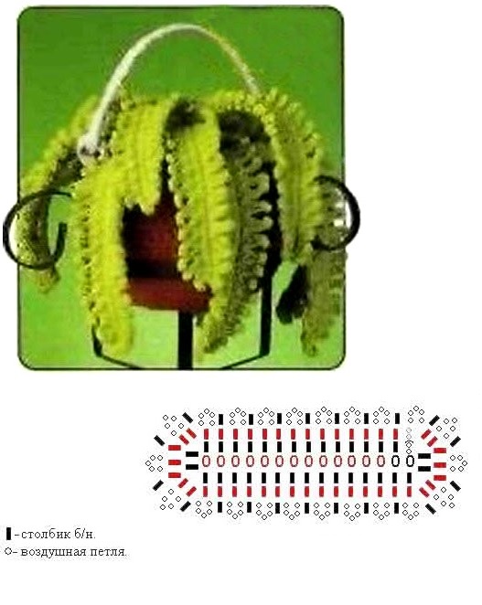 Связать исходную цепочку из 13 ВП. Схема дальнейшего вязания: 1 ВП подъема, 7 СБН. Остальные 6 ВП остаются непровязанными. Из последнего СБН вяжем цепочку из 6 ВП. В 1 п. нижнего р. связать 3 ВП подъема плюс 2 ССН, 2 ССН, 3 ССН с одной вершиной, 1 СС2Н в 7-ой СтБН, 3 СтлбСН с одной вершиной, 2 СтлбСН, 3 СтлбСН с одним основанием.