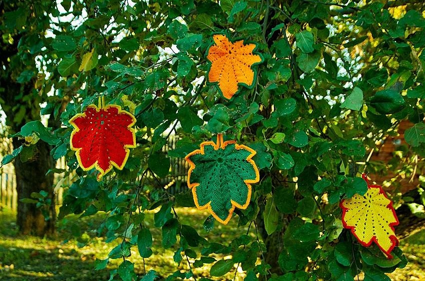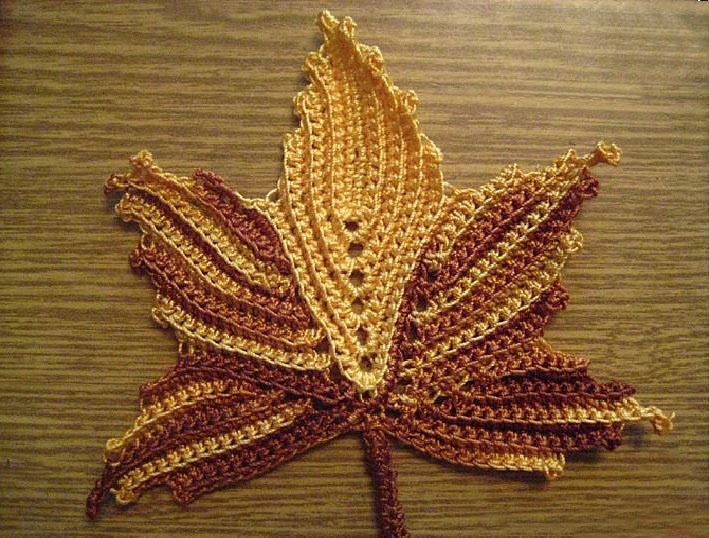 В описании лист связан из трех цветов пряжи – он осенний. По своему желанию вы сможете превратить его в весенний, связав его полностью из зеленой пряжи.