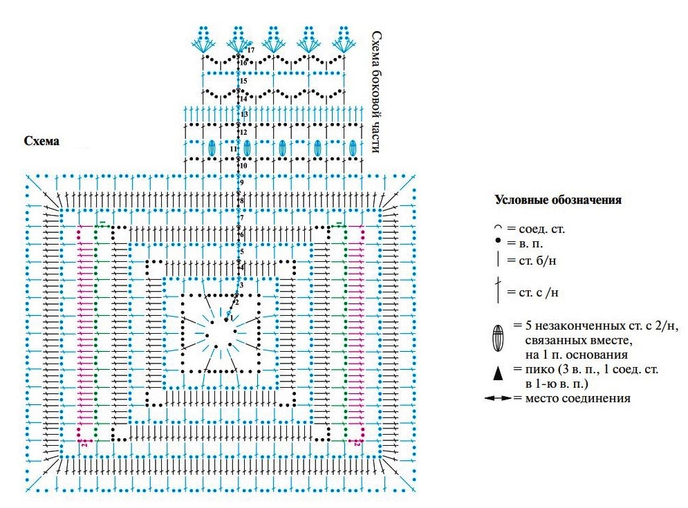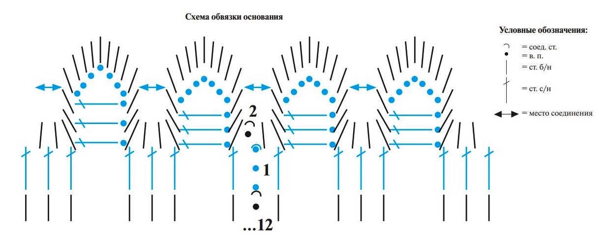 Каждый из след. р. начинаем 1 в. п. и завершаем 1 соед. стлб в 1-ый стлб б/н. Выполняем вязание по указаниям схемы: