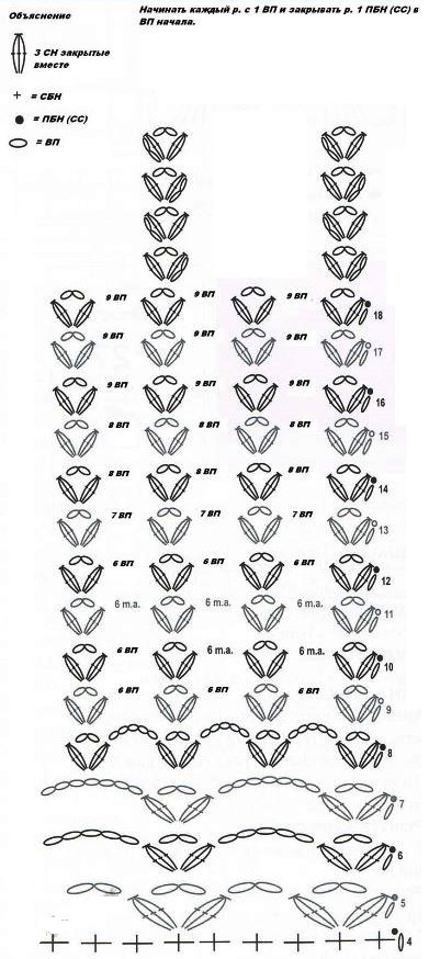 - 2р.: 6 в/п (=3 в/п + 3 в/п), *1 ССН во 2-ой СБН пред-щего р. от крючка, 3 в/п* – от * и до * повтор 18 раз, всего 20 раз, ССТ.