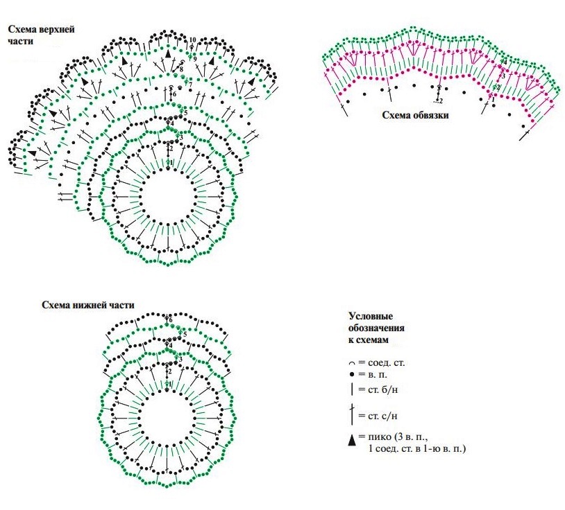 Розовой пряжей набираем крючком цепочку из 24 в/п и замыкаем в кольцо соедин. стлб. Далее вязание выполняем по сх. и описанию: