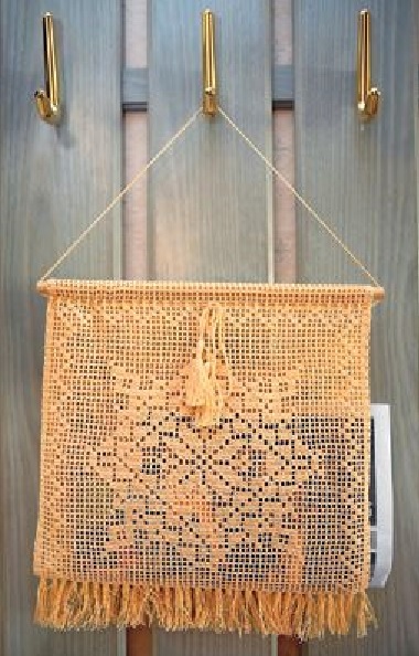Связать шнур из возд./пет. нужной длины. Полотно сложить пополам и между 61-ым и 69-ым рядками продеть шнур и вставить деревянную планку. Шнур завязать бантиком и прикрепить к концам кисточки. К нижней части газетницы привязать кисточки. Кисточки расчесать и подрезать.