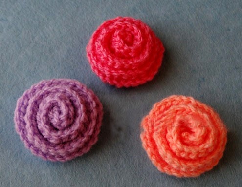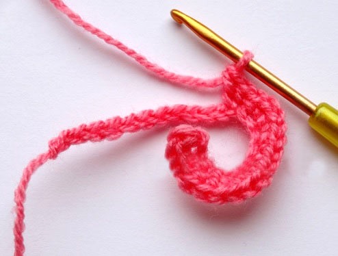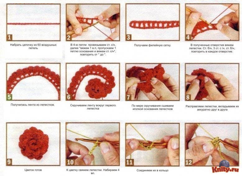 Сворачиваем связанную полосу по спирали, формируя розочку. Фиксируем готовый цветок стежками по петелькам исходной цепочки.