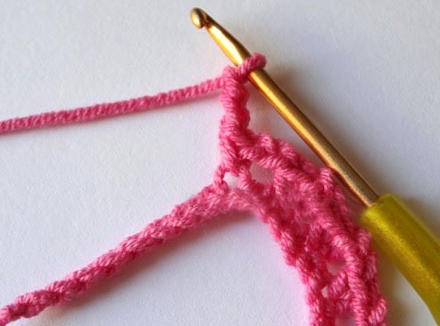 - 1р.: пропускаем начальные 4 возд. п. В 5-ую п. связать СтБН, *2 возд. п., пропустить 1 возд. п., 1 СтБН* – от * и до * повторить до конца р., повернуть вязание;