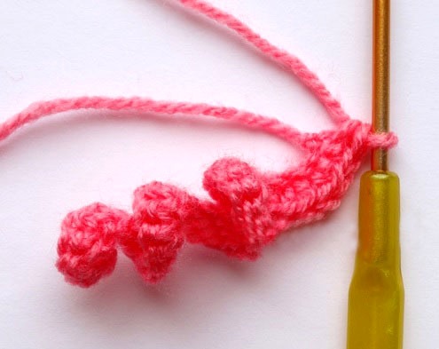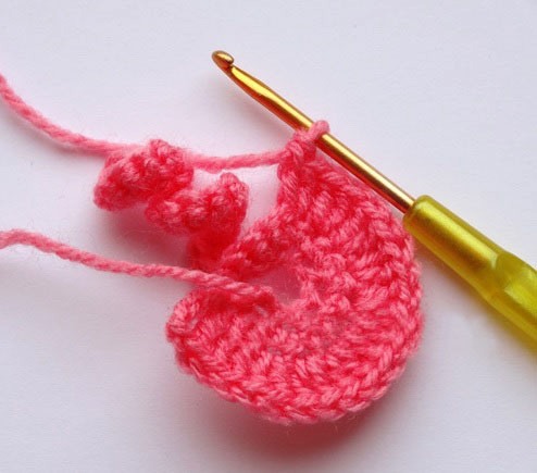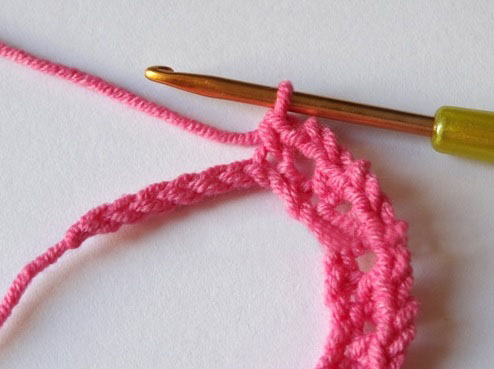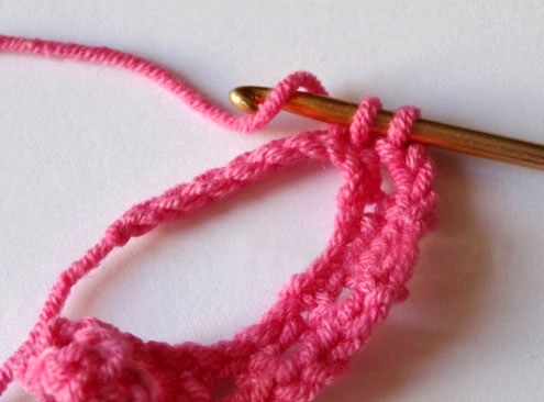 - Переворачиваем вязание лицевой стороной вверх и делаем под арочки стлб для лепесточков, как описано выше.