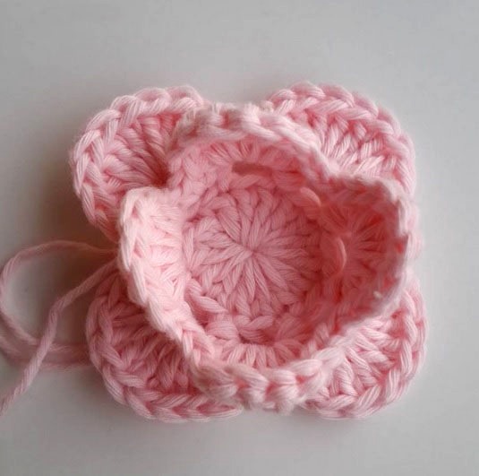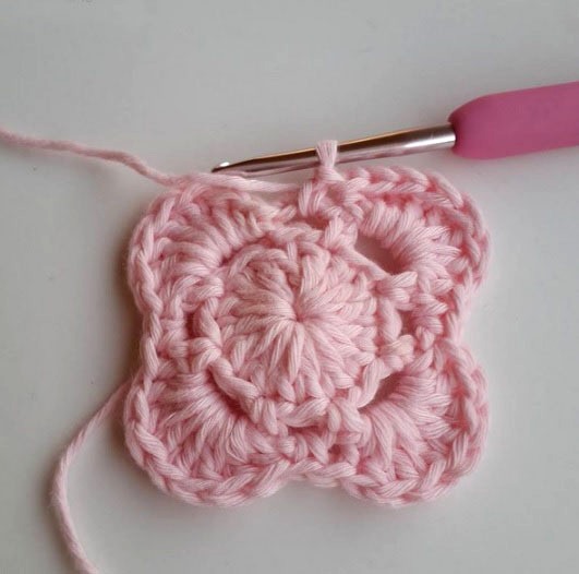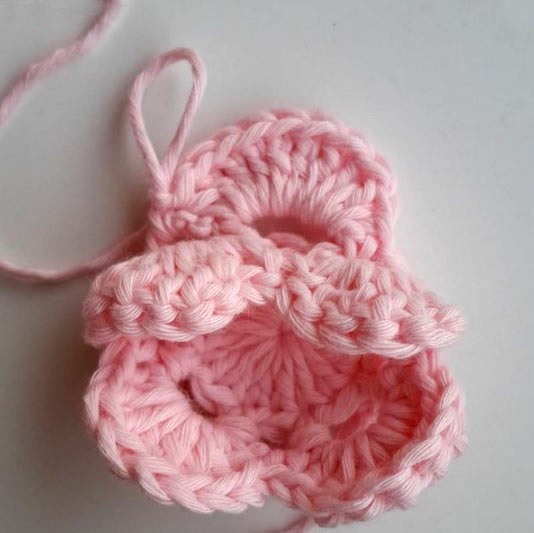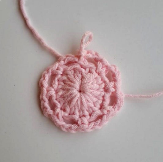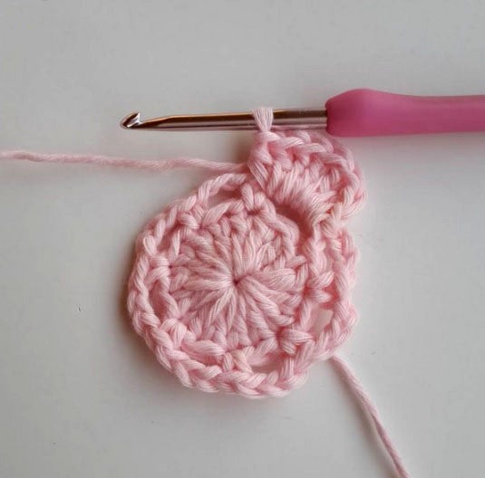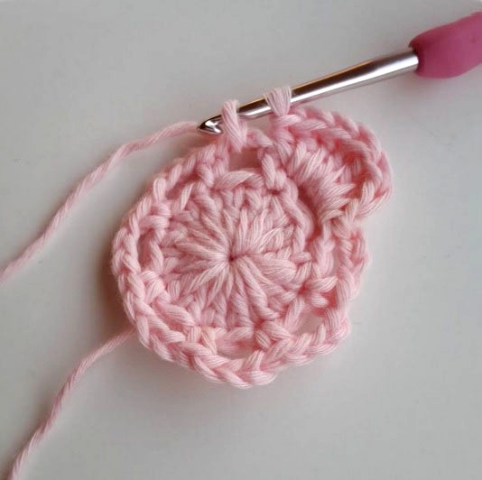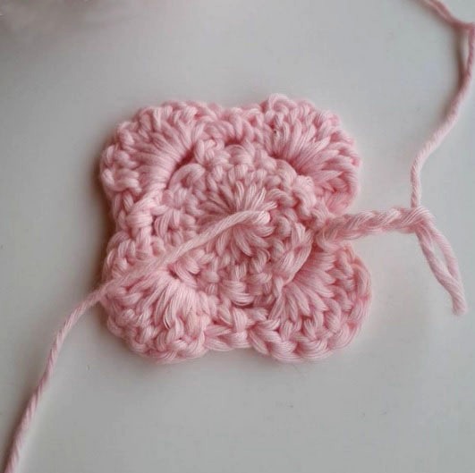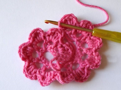 Переворачиваем цветочек лицевой стороной вверх и, повторяя схему узора, вяжем третий ряд лепестков.