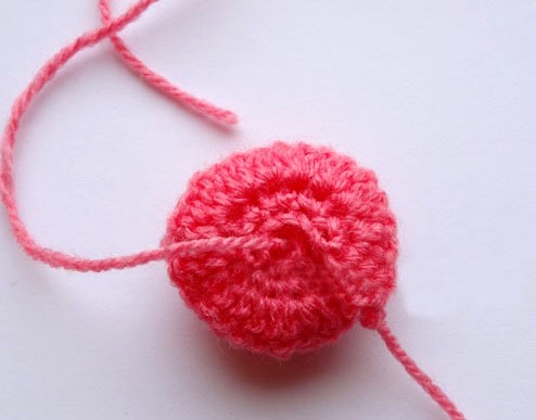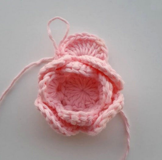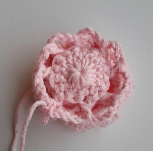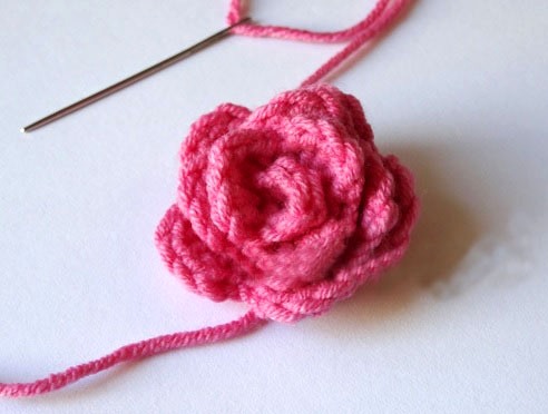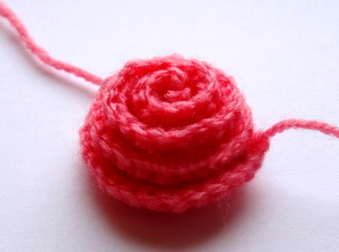 Завершить вязание, обрезать нитку, оставляя длинный хвостик. Он нам пригодится для фиксации розы.
