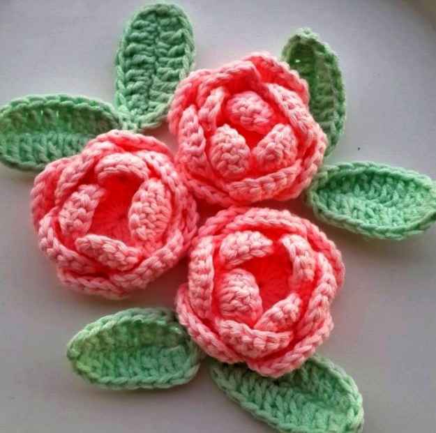 По желанию, для отделки можно связать листья розы крючком. Подробный мастер-класс по вязанию различных вариантов листочков смотрите в специальной статье на нашем сайте.