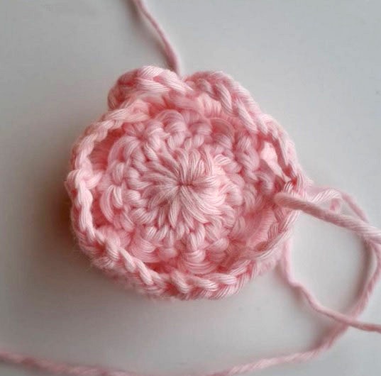 - Связать цепочку из 2 возд. п. и в кольцо провязываем 15 стлб с нак. Замыкаем ряд в круг СС в верхнюю из исходных петелек. Плотно стягиваем кольцо – центр цветка должен быть без дырочки.