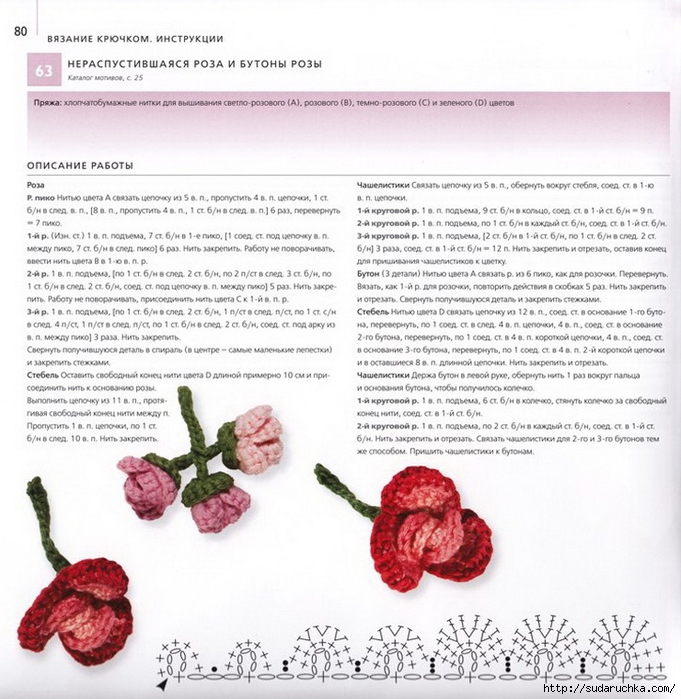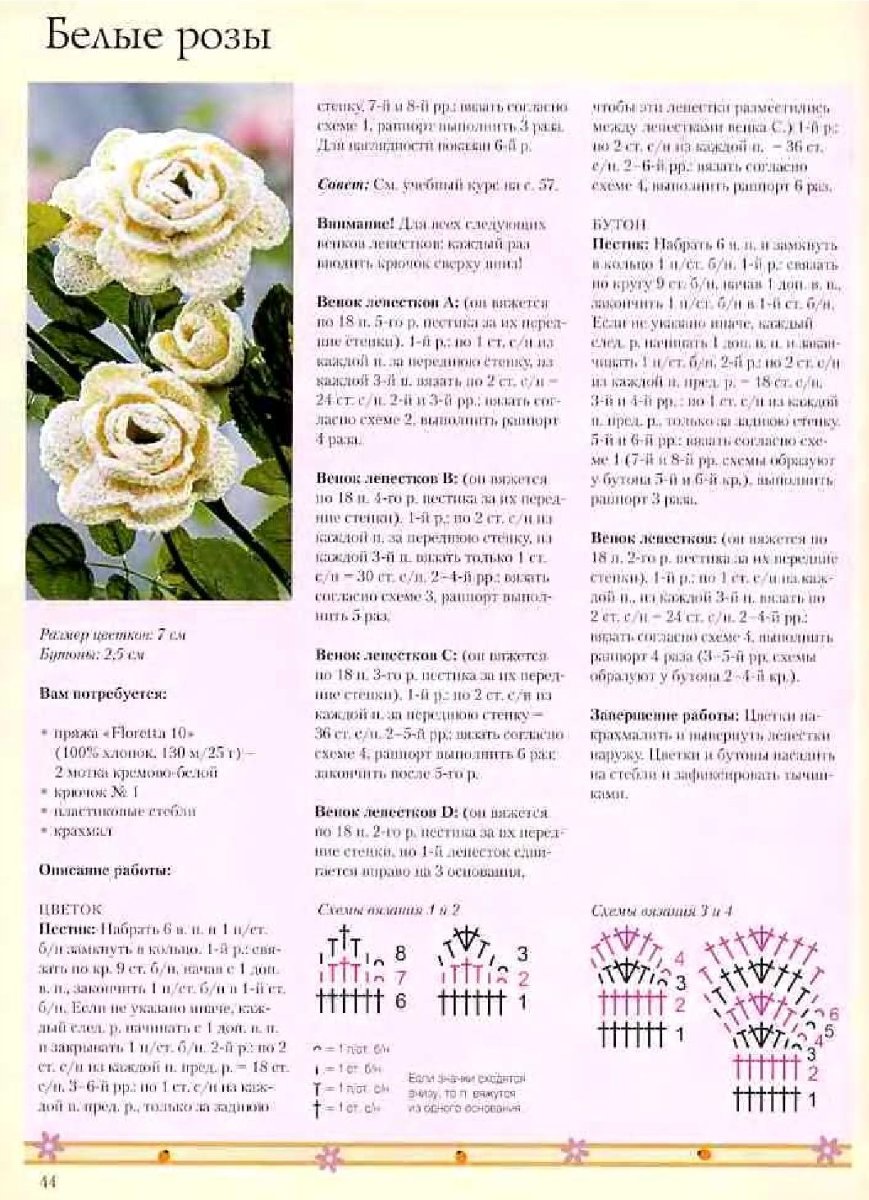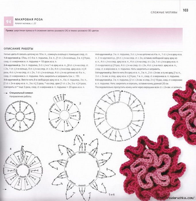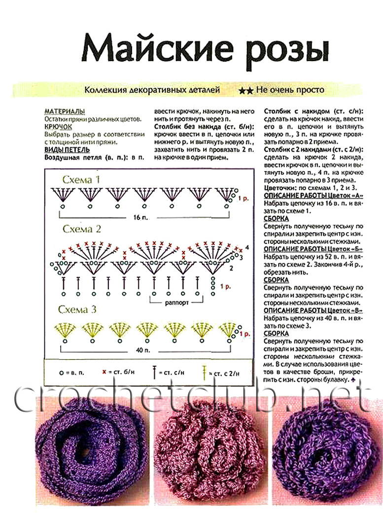 Раппорт узора равен 2 ВП. По своему желанию вы сможете увеличить размеры розочки, изменив кол-во п. в исходной цепочке.
