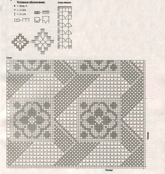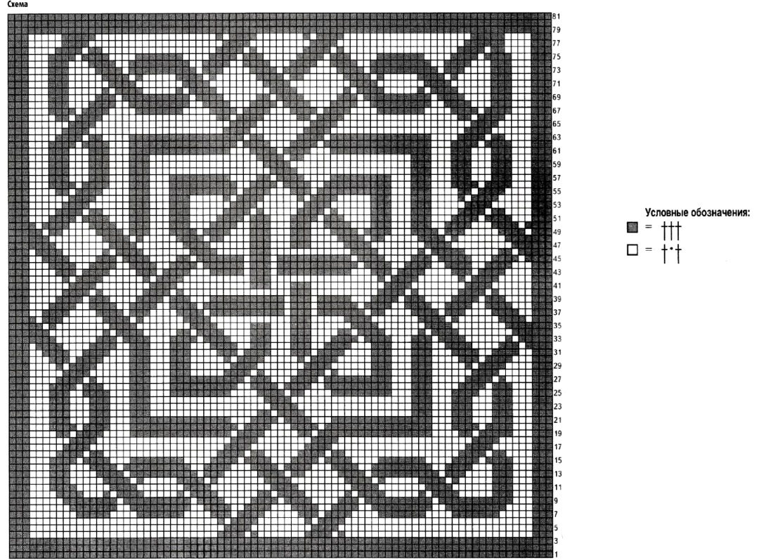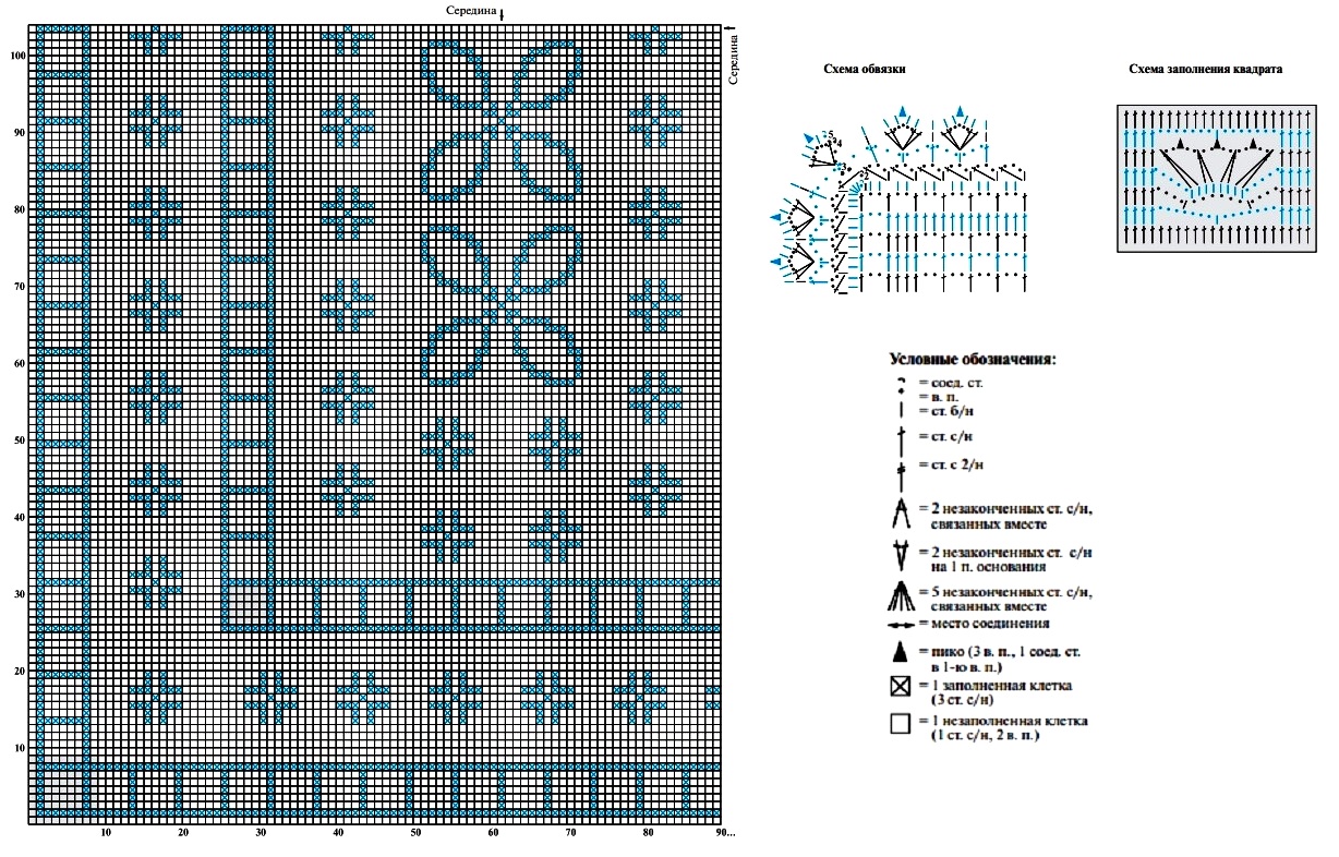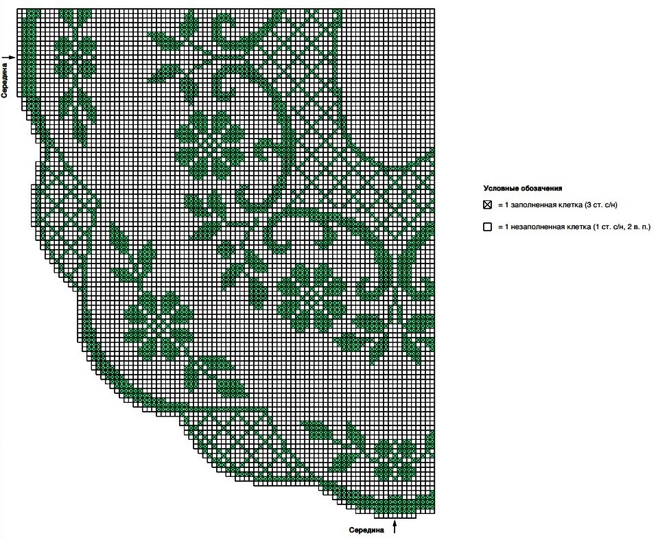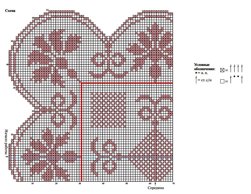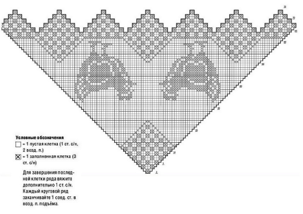 Узор: филейное вязание: пустой квадратик схемы – вяжем 1 стлб с/нак. и 2 в/п, заполненный квадратик схемы – вяжем 3 стлб с/нак. Каждый рядок начинаем с 3 в/п подъема, заменяя 1-ый стлб с /нак. Завершаем рядки 1 стлб с/нак. в в/п подъема предыд. ряда.