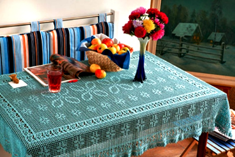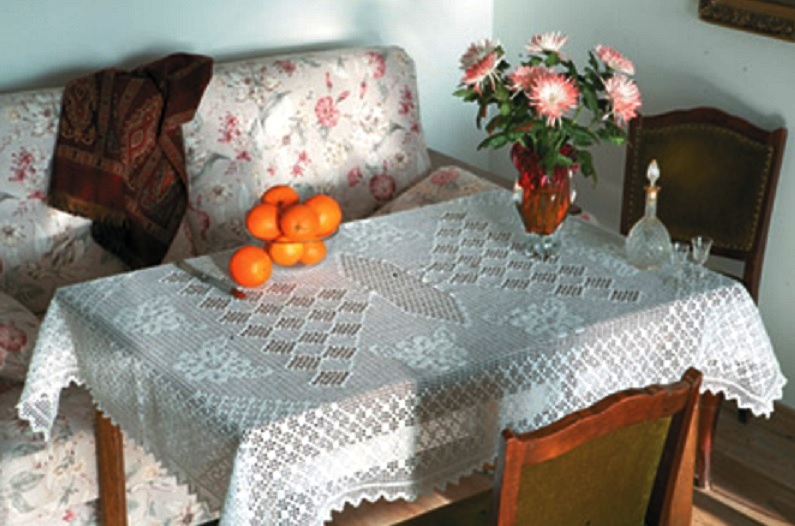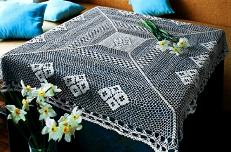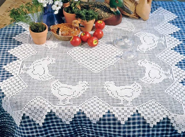 Полотно, вывязанное в филейной технике, выглядит как сеточка с заполненными и пустыми ячейками. Из их комбинаций и складывается рисунок. Несмотря на простоту выполнения, работая в этой технике можно вывязать очень изысканные и красивые вещи. Особенностью филейного вязания является то, что интересный, а значит и более сложный рисунок можно получить на большом полотне. Например, филейное вязание крючком скатерть схемы, рассмотренные в этой статье воплощает самые разные сюжеты – геометрические символы, цветы, сельские мотивы.