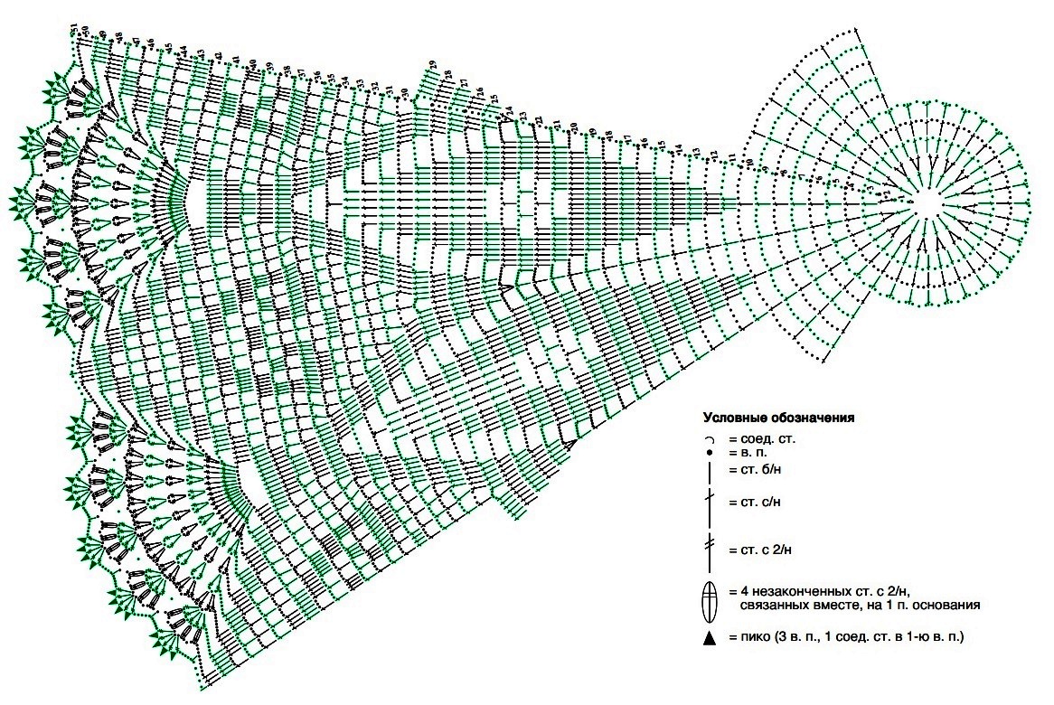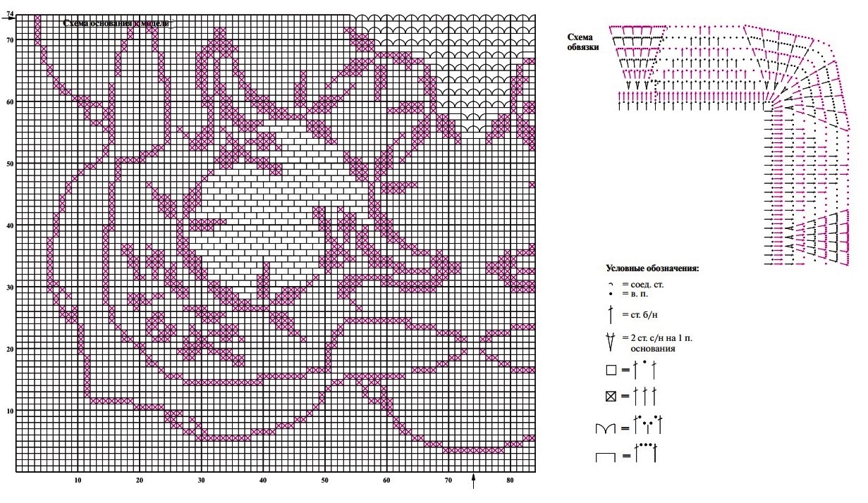 Набираем 243 в/п плюс 3 в/п подъема. Вывязываем скатерку по схеме. Закончив основное полотно, выполняем вкруговую обвязку полустлб с /н.