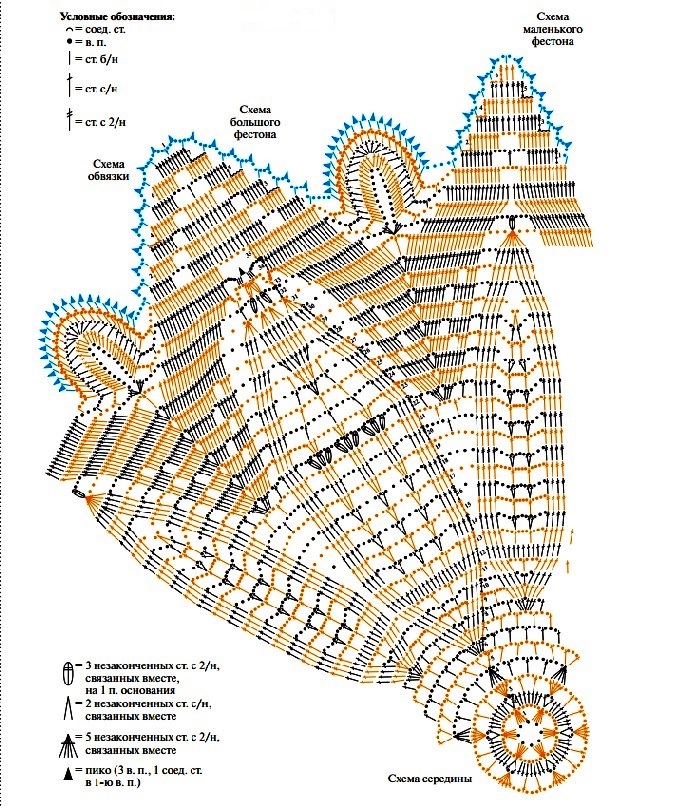 Далее вязку выполняем вкруговую, вывязывая филейный узор по счетной сх. На ней изображен только один фрагмент. Начиная с 66-го р. каждый фестон вяжем отдельно прямыми/обратными рядками.