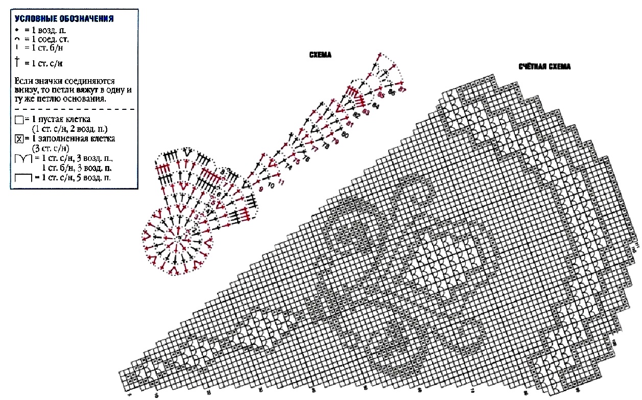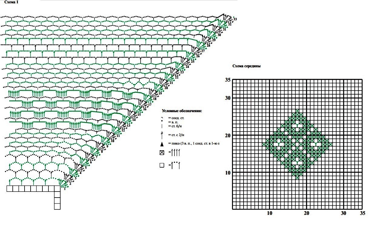 Набираем цепочку из в/п длиной 1м и выполняем вязание по счетной схеме. Ряды на ней показаны не полностью, продолжайте вязку по аналогии.
