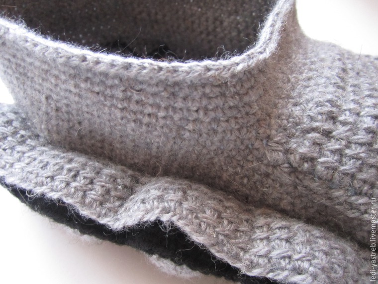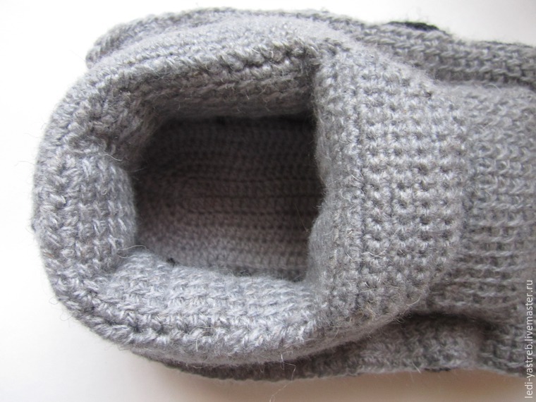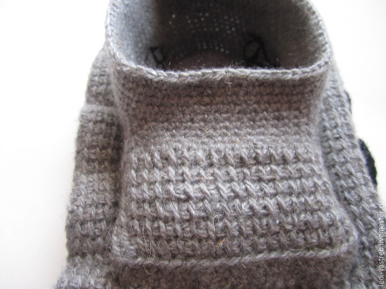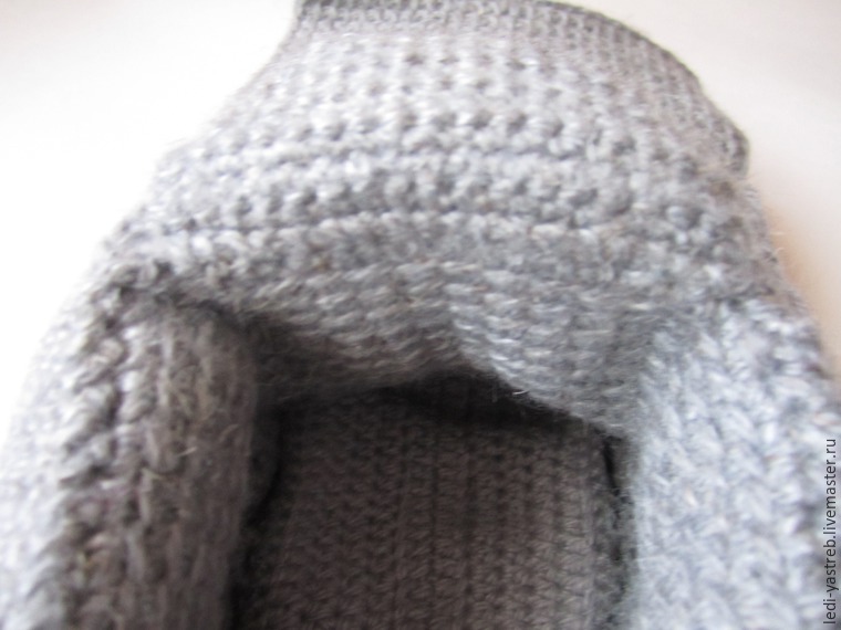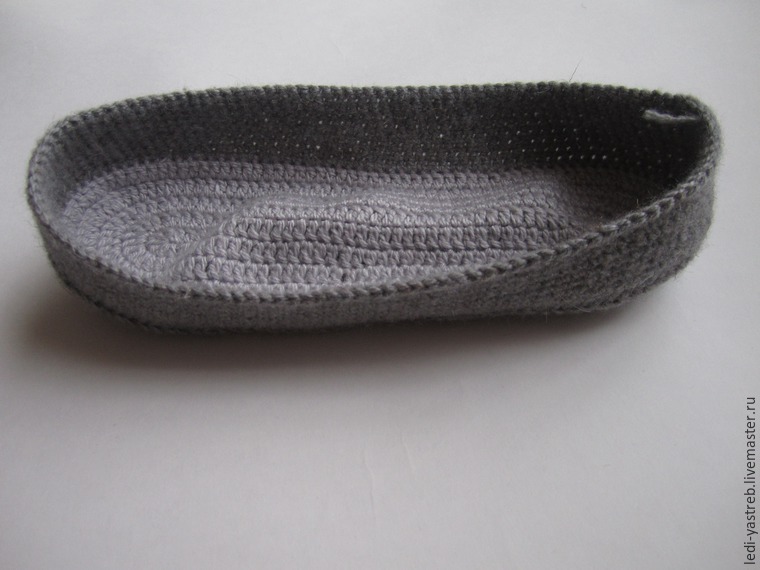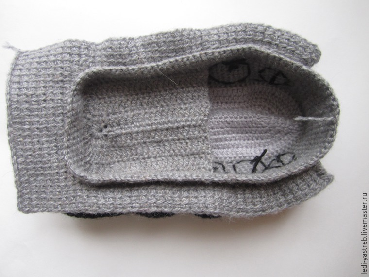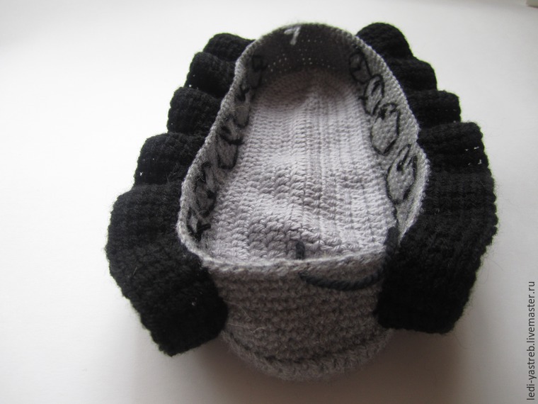 Пришиваем верхний элемент тапочка к подошве, выворачиваем изделие на изнанку и обвязываем таким образом –1 СБН, 2 пет. пропустить, 5 ССН в пет. основания, 2 пет. пропустить и т.д.