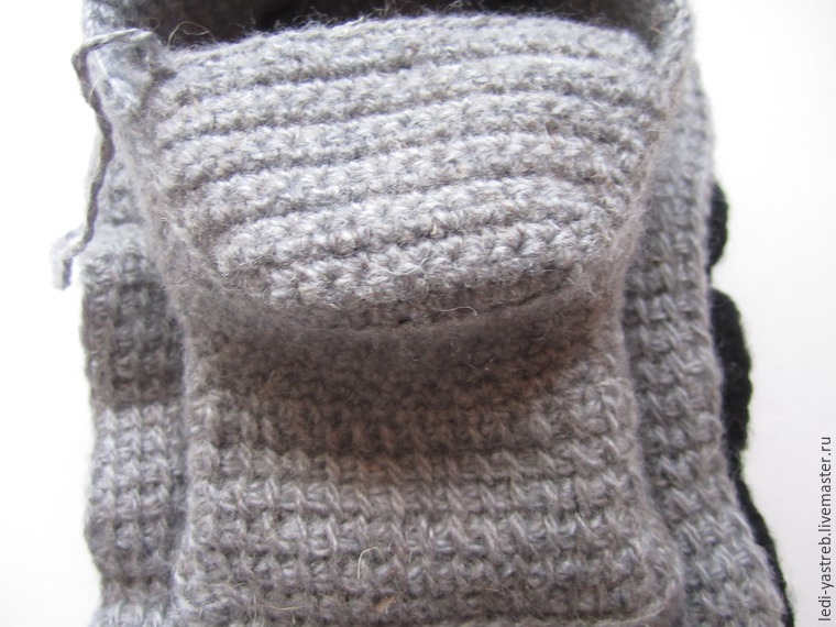 Переходим к сборке следков из мотивов. Складываем все мотивы подошвы и верха и сшиваем 4 из 6 сторон. К оставшимся сторонам пришиваем ещё по 1 мотиву и соединяем все швы на подошве и пятке.