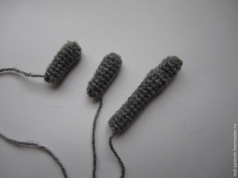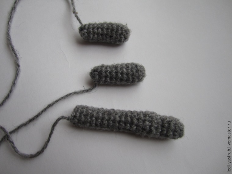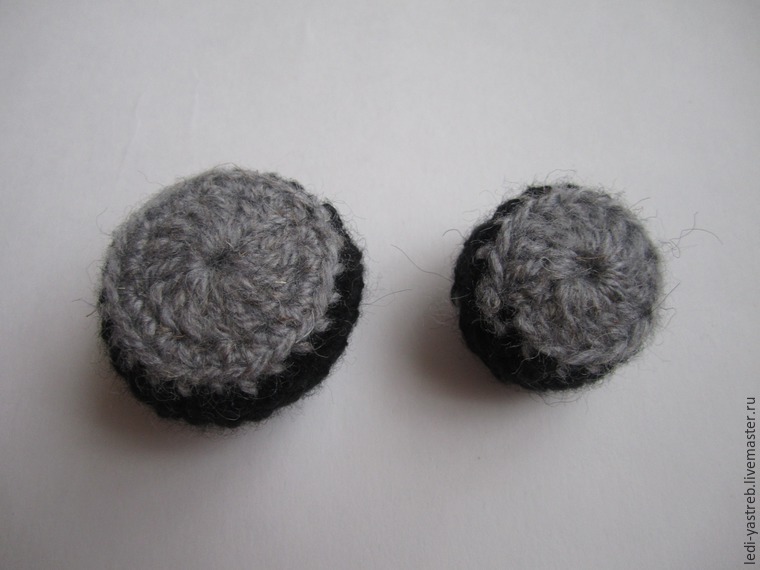 Большое: скольз. петля, 6 С-ков Б/Нак. В след. ряду каждый ст-к провязываем в такой последовательности – 1 С-к Б/Нак, 2С-ка Б/Нак, 1 С-к Б/Нак, 2 С-ка Б/Нак. Крепим чёрную пряжу и выполняем 2 ряда С-ка С/Нак в каждую петлю. Теперь чёрная нить нам не нужна, крепим серую. Далее, приступаем к уменьшению кол-ва пет. В каждый с-к пред. ряда – 1 С-к Б/Нак, 2 С-ка Б/Нак вместе, 1 С-к Б/Нак, 2 С-к Б/Нак вместе. Повторяем, пока ряд не закончится. В след. ряду вместе вывязываем по 3 С-ка С/Нак, затягиваем кольцо, после чего протягиваем кончик рабочей нити внутрь. Перед тем, как завершить посл. ряд, необходимо набить колёсико наполнителем.