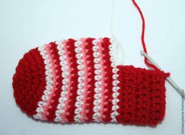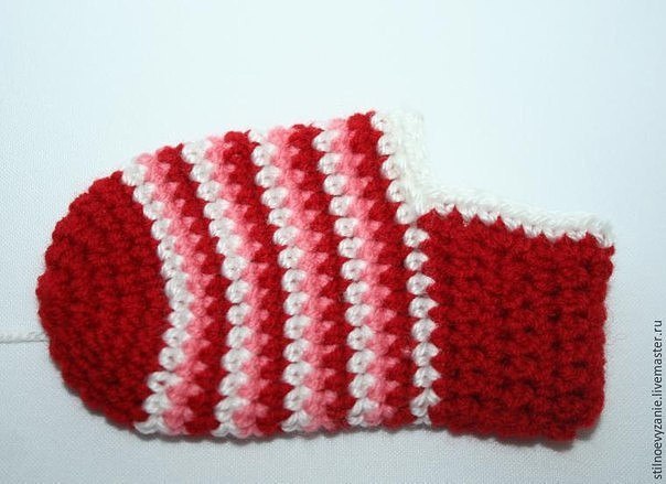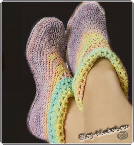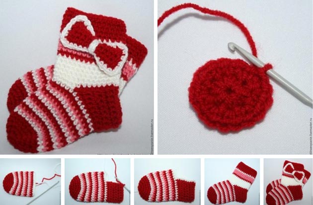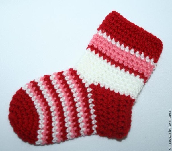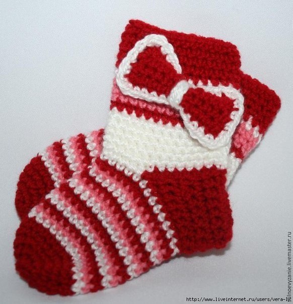 Носочки вяжем круг. рядами и только С-ками Б/Нак. Периодически будем менять цвет нити, что придаст изделию особый шарм. В конце, декорируем их бантиком.