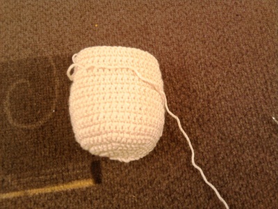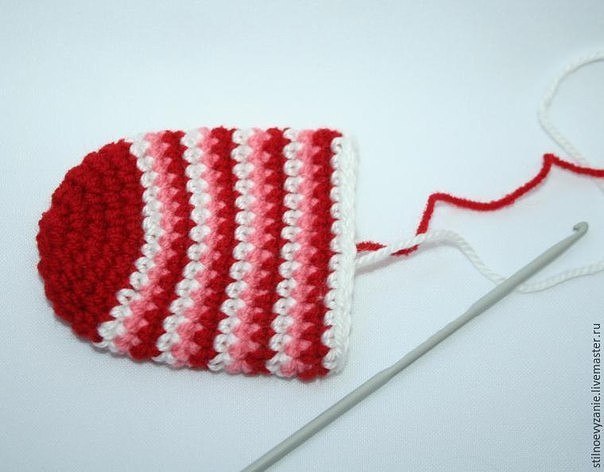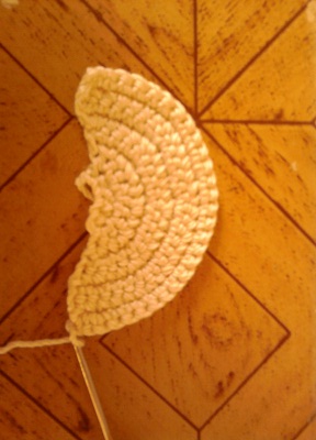 На скользящей петле делаем 9 С-ков Б/Нак и так вяжем 9 рядов. На 10-ом убираем по 3 петли, набиваем наполнителем и пришиваем