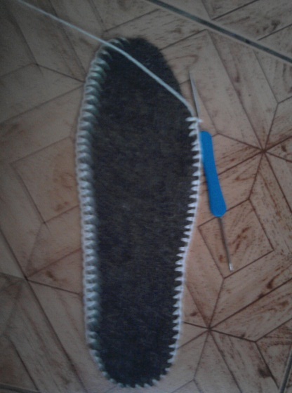 Прикладываем верхнюю часть тапочка к подошве и соединяем их СБН. К подошве можно прикрепить войлочную или китайскую стельку.