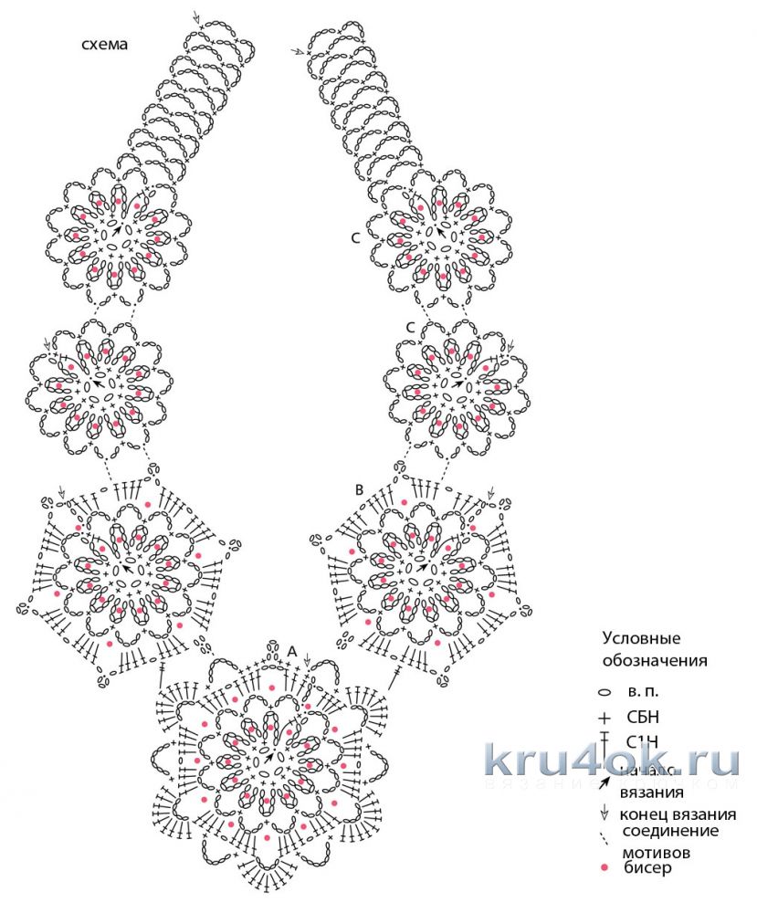 Теперь обвязываем бусины крючком примерно по такой схеме: