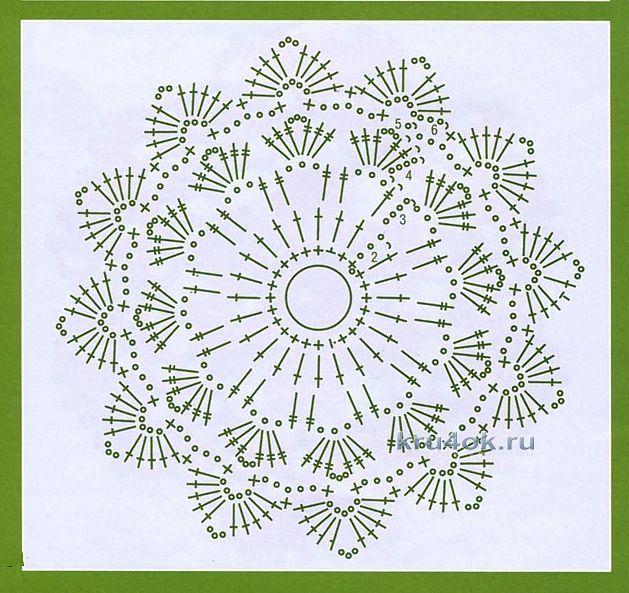 Набираем цепочку из 12 ВП, соединяем ее в кольцо и вяжем согласно такой схемы: из каждой петли провязываем 1 ст. без нак, 1 ВП, 1 ст. без нак, 1 ВП, 1 полуст. с нак, 1 ВП, 1 полуст. с нак, 1 ВП, 1 ст. с нак, 1 ВП, 1 ст. с нак., 1 ВП.