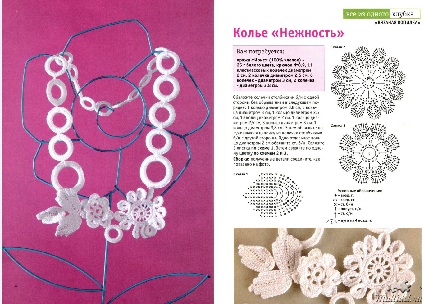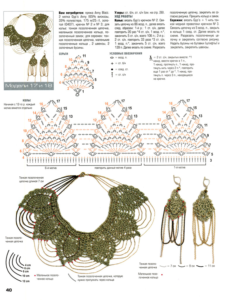 Изделия состоят из мотивов. Сначала вяжем главный, большой мотив для колье, от него сразу вяжем средние.