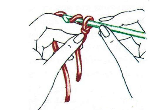 Обогнув его снизу, проводим над указательным. При вязании нить плотно зажимаем между большим и указательными пальцами.