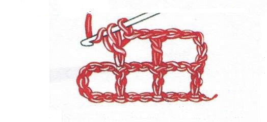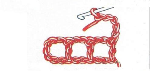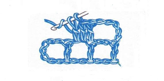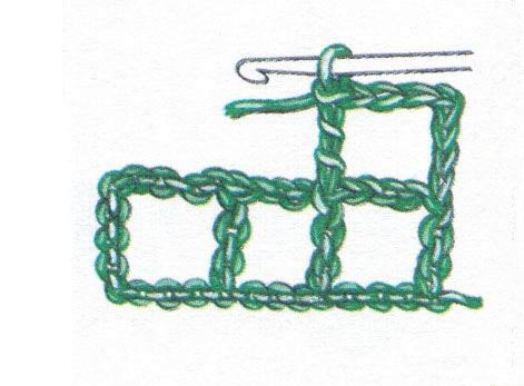 Каждая ячейка состоит из 3 возд/п и СС2Н. Выполняем цепочку из возд/п. Их кол-во должно быть кратно 4 плюс 10 возд/п. Для 1-ой ячейки провязываем СС2Н в 11-ую п. цеп-ки, далее *3 возд/п, пропускаем 3 возд/п основания, 1 СС2Н в след-щую п. основания*. От * и до * повторяем для всех ячеек.