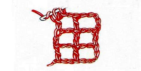 Заполнение сетки выполняется 4-мя СС2Н. Для заполнения 1-ой ячейки вяжем 4 возд/п (равно 1-му СС2Н), *3 СС2Н, провязываемыми в цеп-ку из 3 возд/п пред-щего р., 1 СС2Н в стлб пред-щего р*. От * и до * повторяем для всех заполняемых клеточек.