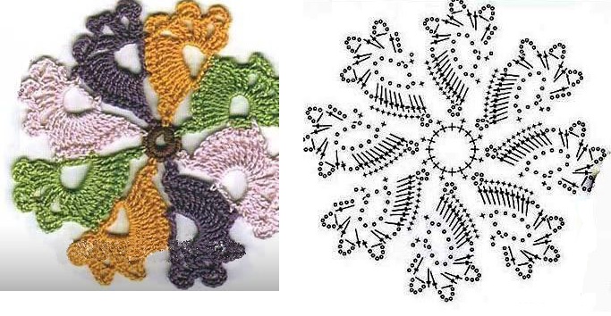 Во 2-ом р. и в след-щих вяжем 4 возд/п (замена 1-го СС2Н), *(3 возд/п, 1 СС2Н) – в предпоследнюю птл СС2Н пред-щего р.* От * и до * повторяем для всех ячеек.