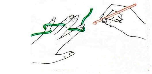 Описание – для правшей, если вы левша, то все действия повторяете зеркально. Итак, крючок мы держим в правой руке – см. фото. Придерживаем его указательным и большим пальцами, как ручку или карандаш. Локти и кисти рук при этом должны двигаться свободно. Конец нити, пропускаем между мизинцем и безымянным пальцем, делаем оборот. Затем протягиваем над пальцами и заводим между безымянным и средним пальчиком.