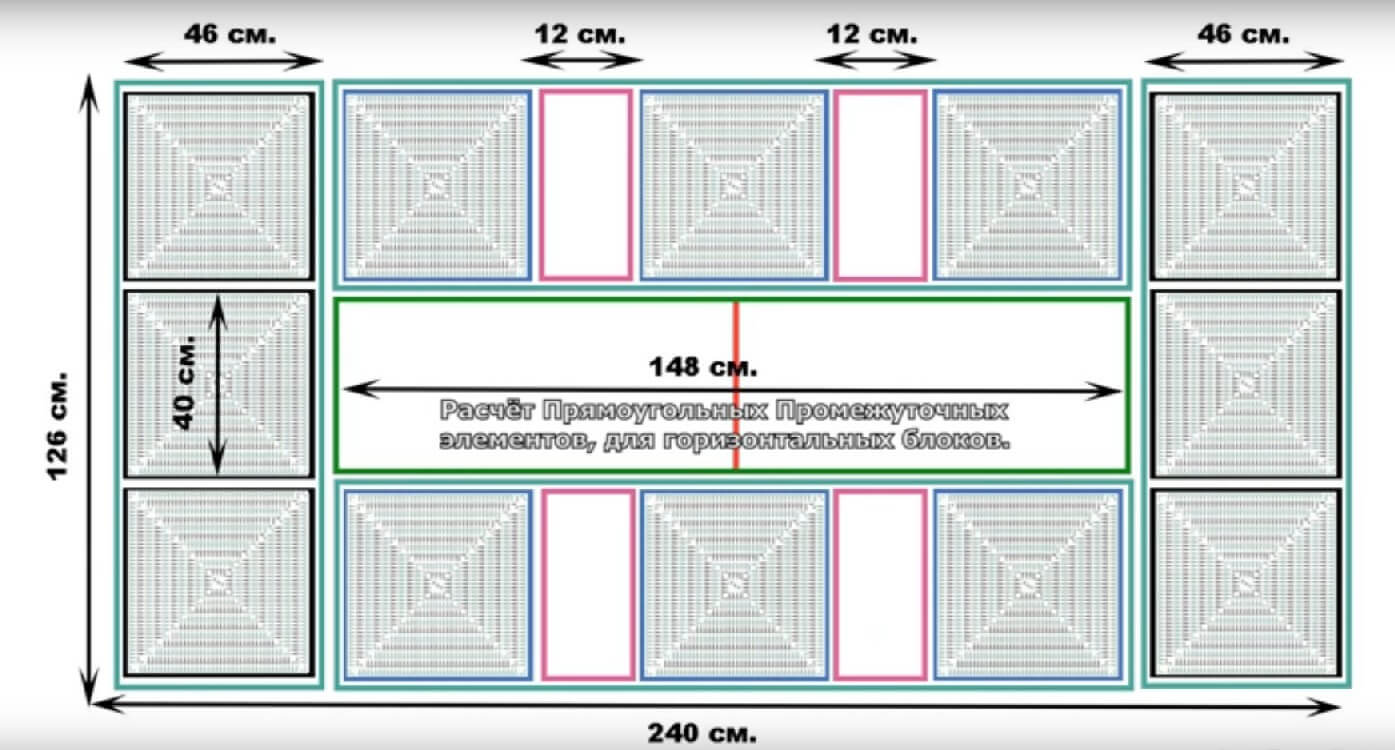 Зная длину центрального фрагмента и длину сторон квадрата без обвязки 40 см, вычисляем размеры и расположения фрагментов горизонтальных блоков.
