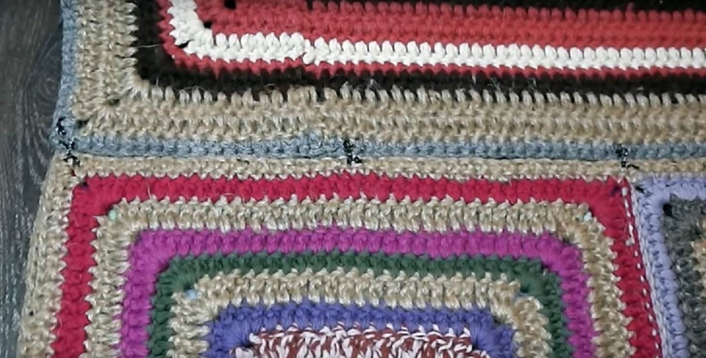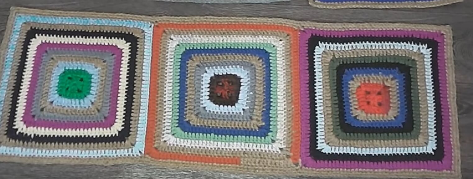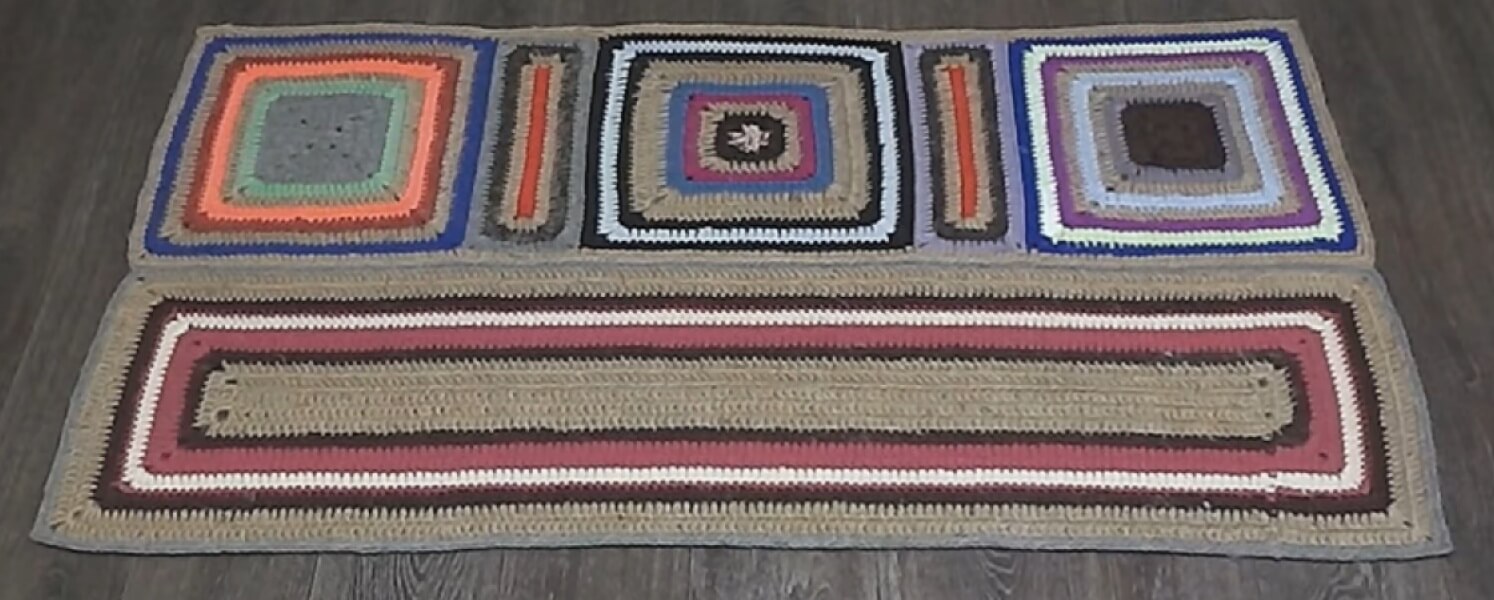 Ковёр собран из элементов разного размера, связанных способом «бабушкин квадрат». Элементы состоят из трёх квадратиков, связанных между собой. Каждый отдельный элемент обвязан джутовой нитью.