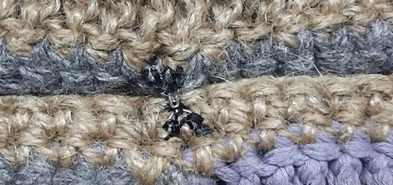 Джутовая нить используется в два сложения, пряжу складываем в два-три сложения, подгоняя под размер крючка.