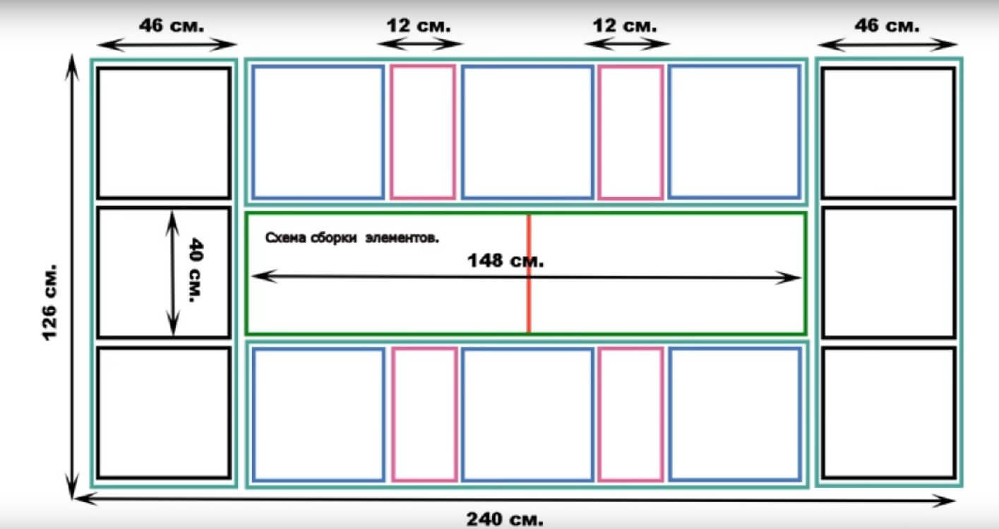 Таким образом, по длине и ширине фрагмента мы получим плюс 6 см. Он будет иметь размеры 46 на 126 см.