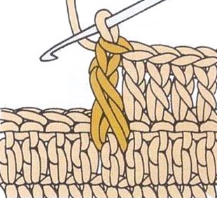 Итак, набираем небольшое количество воздушных петель для вязания образца и провязываем два рядочка простыми столбцами с накидыванием для уплотнения края. Теперь вяжем непосредственно рельефный лицевой столбец: выполняем накидывание пряжи на крючок, вот так: