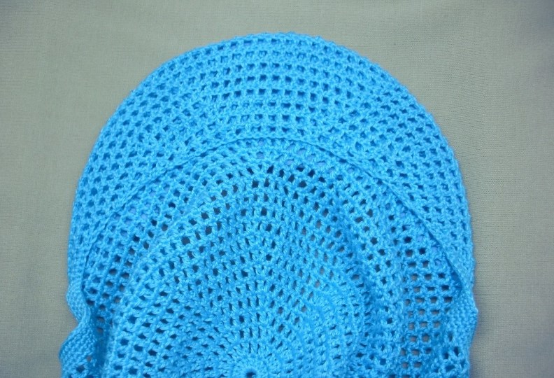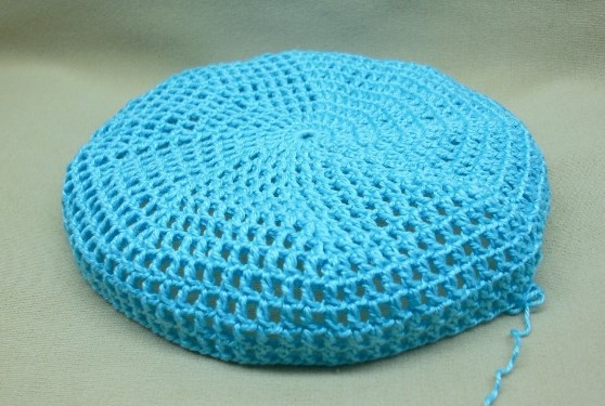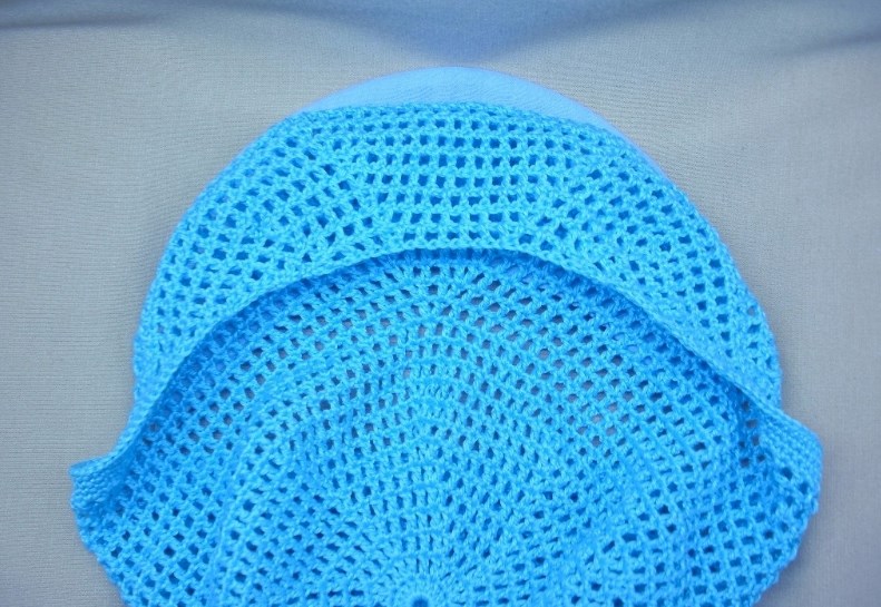 Провязав эти два дополнительных рядка, отрезаем ниточку и присоединяем ее к области бейсболки, которая будет прилегать к затылку, от этой точки продолжаем круговое вязание.