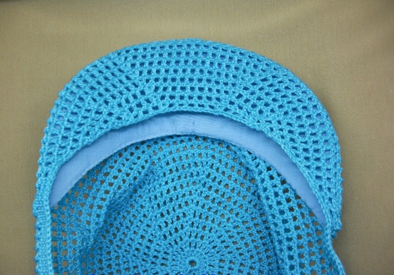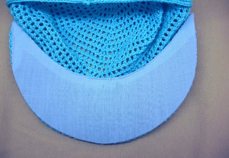 Теперь нам нужно только пришить внутреннюю вогнутую часть козырька к бейсболке, для чего используем шов «через край» и аккуратно пришиваем картонную заготовку к вязаной части, немного отгибая рядок, который мы провязали рачьим шагом – так мы прячем шов вовнутрь.