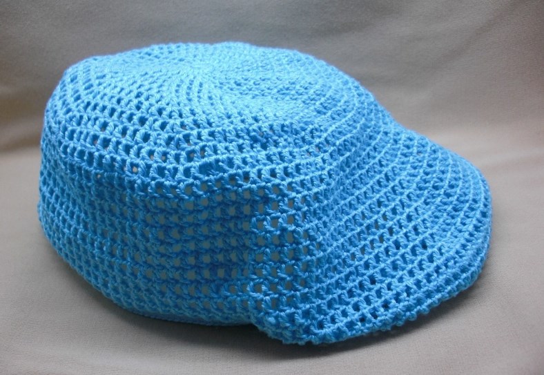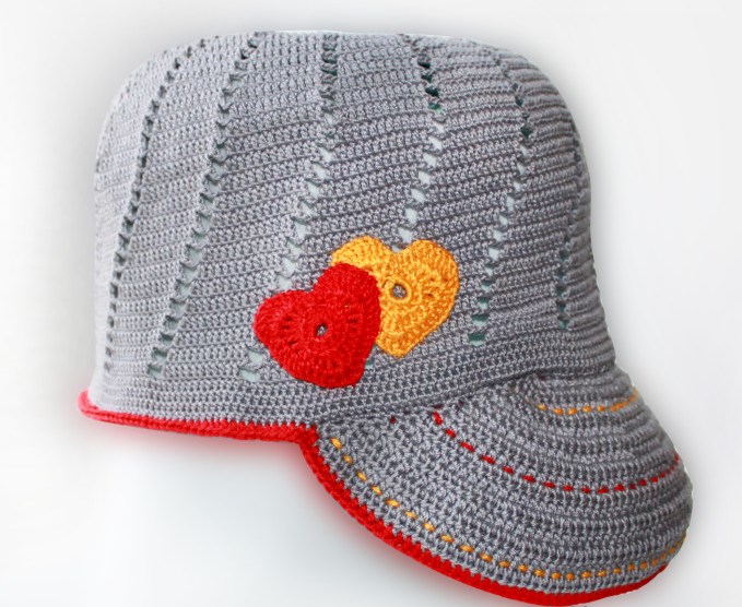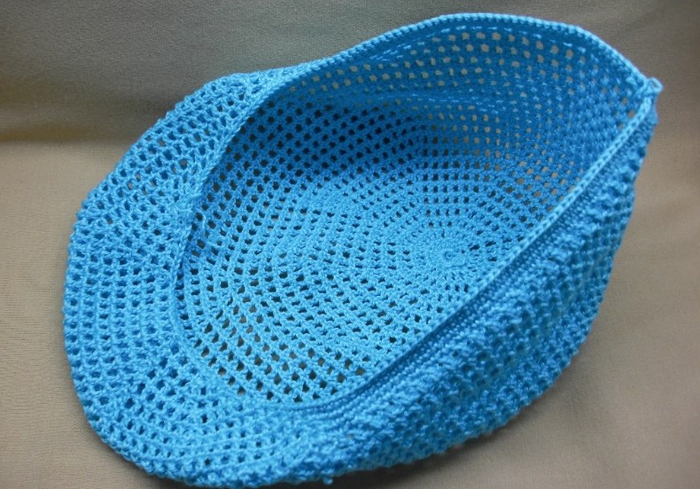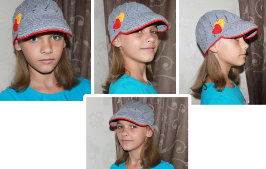 Обвязываем козырек по следующей схеме: *2 с. без н., 2 в. п.*, повторяем от 8 до *. Привязываем или пришиваем козырек к основной части бейсболки. После этого провязываем по кругу основы 6 рр. с. без н.