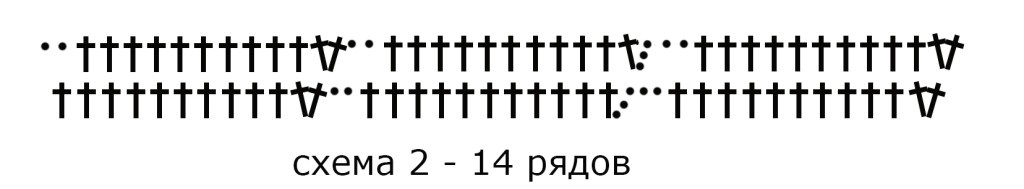Далее провязываем 14 р. согласно схемы 2, смещая узор на одну петлю – в 1-й столбик вяжем 2 столбика, крайний столбик мотива не провязываем. То есть, у нас в мотиве остается 12 столбиков с двумя в. п. между мотивами.