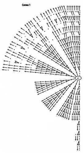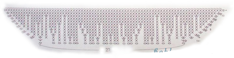 С помощью крючка набираем цепь из 28 в. п., вяжем на них по схеме 2, не забывая о прибавках по бокам.