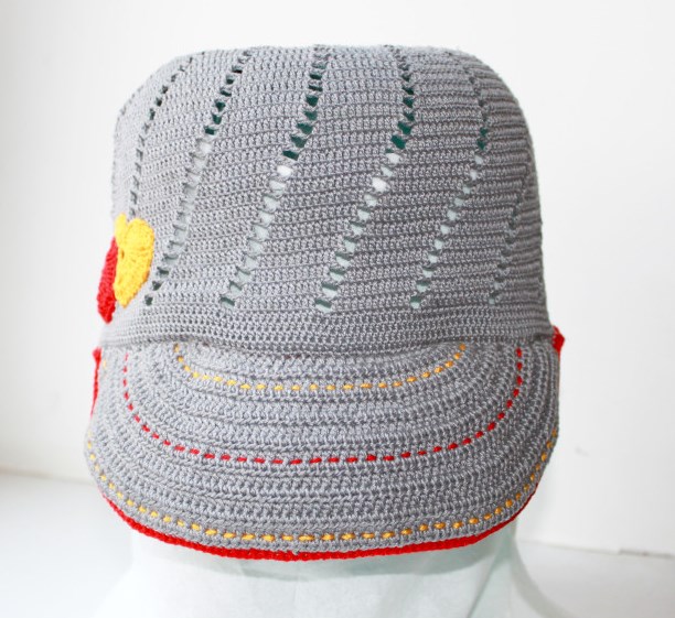 Обвязываем внутр. шов (то место, где стыкуются козырек и бейсболка) контрастной ниткой (мы использовали красную пряжу). Все концы отрезанных ниток прячутся под красной и край работы выглядит аккуратней.