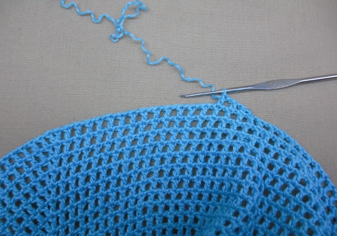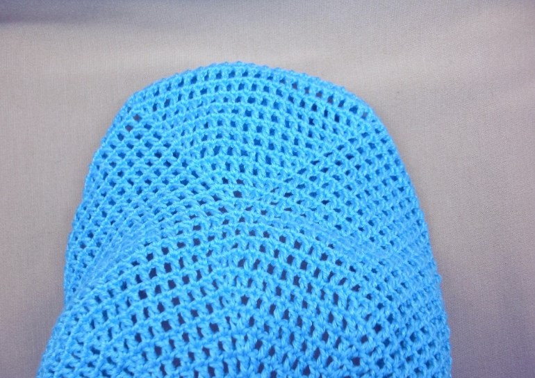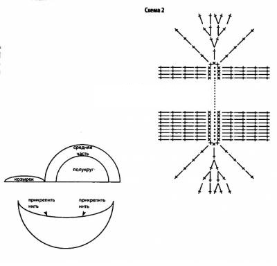Теперь приступаем к вязанию козырька по схеме полу-столбиками с накидом и пряжей, сложенной вдвое – для плотности.