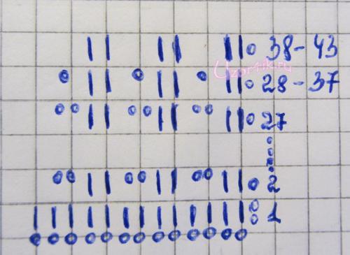 Далее (по подсчетам с 44-го р.) выполняем равномерные убавки по 1 п. в кажд. 2-м р. сначала через 10 п., далее через 9, 8, 7, 6, 5, 4, 3, 2 и через 1, все остальные петли убавляем до конца.