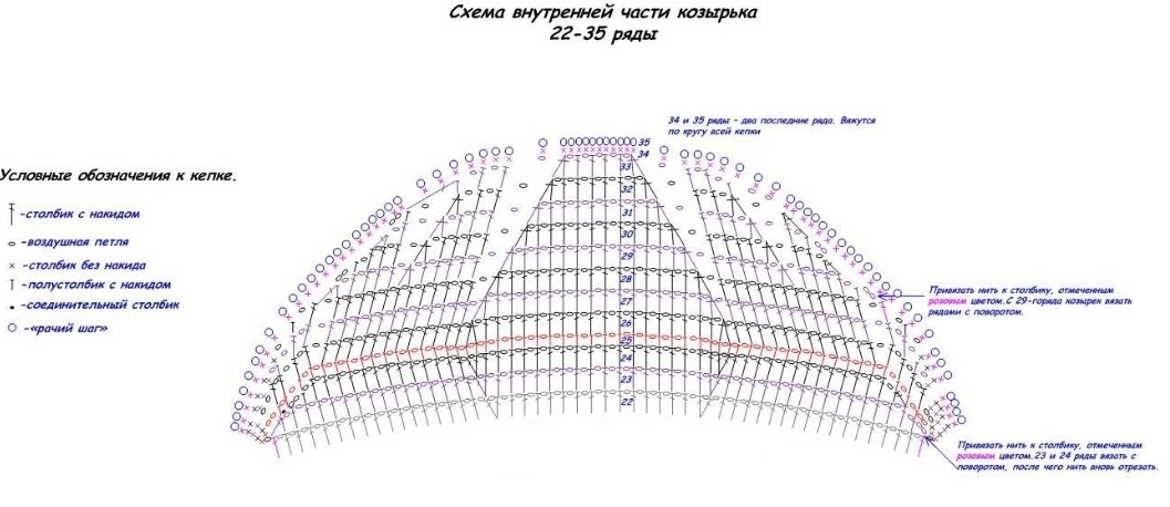 - 27 р.: по линии кепочки провязываем с. без н., а, когда дойдем до козырька, нам нужно будет провязать 2 с. без н. в 2 в. п. нижнего р. и 1 с. без н. в 1-й с. с н. филейной сеточки козырька, 1 в. п., 1 полуст. с н., 1 в. п., 1 с. с н. и так далее. Продолжаем вязание сеточки козырька с убавками, как и в нижнем рядочке по схеме.